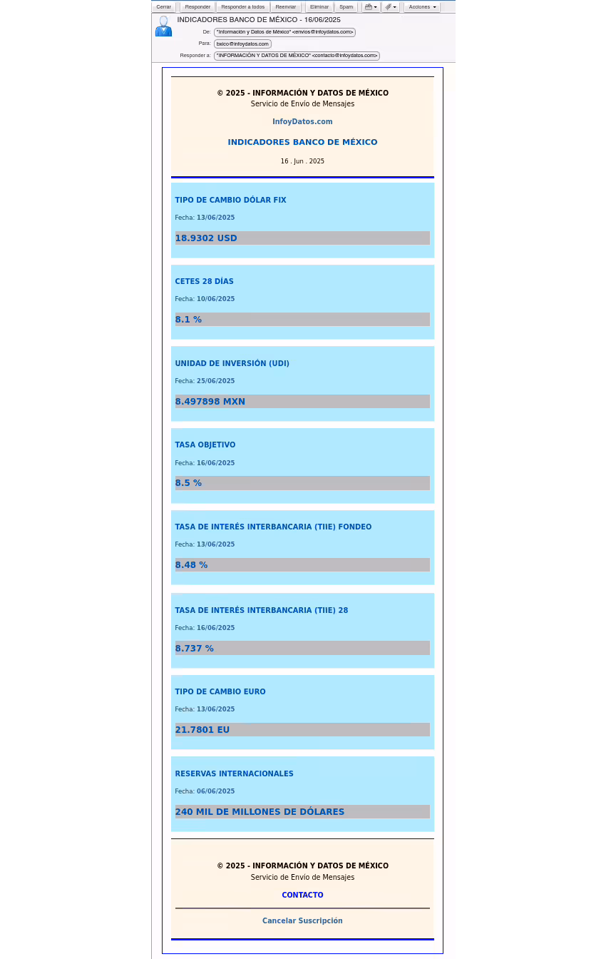 Te envíamos Tipos de cambio, valor de la UDI, etc, entre otros.